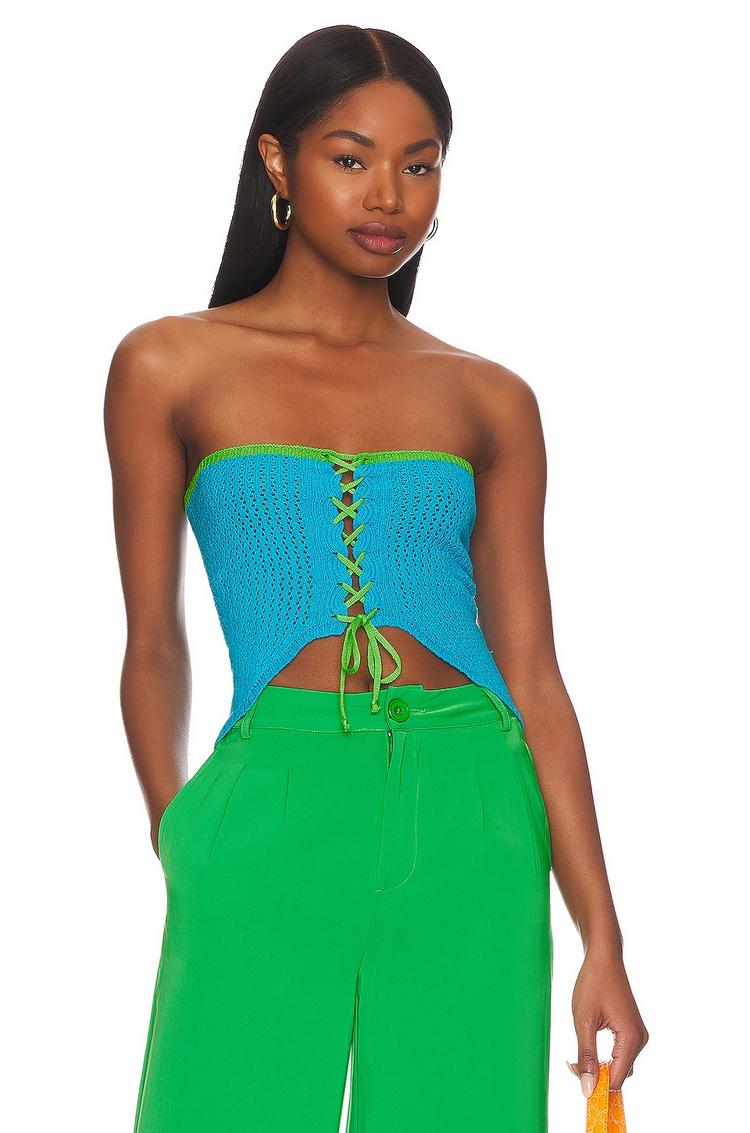 Bright blue open knit crochet fabric defines this fitted cropped top, featuring a straight neckline and strapless sleeveless styling for a sleek look. The standout lace-up front panel in bright green adds a trendy contrast and adjustable detail. Perfect for spring and summer, this versatile piece fits seamlessly into casual outings, brunch dates, or night out ensembles, pairing effortlessly with high-waisted bottoms for a chic silhouette.