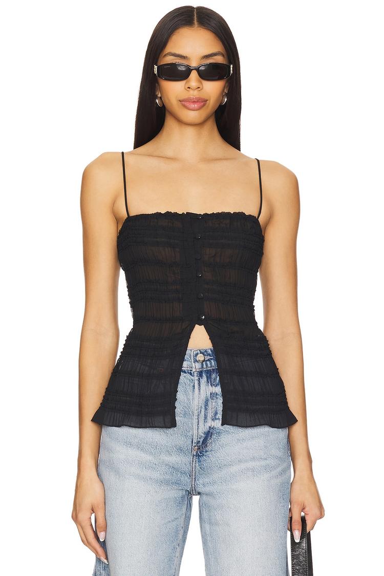 Lightweight chiffon and ruffled accents throughout define this chic camisole, perfect for warm weather styling. The slim fit and straight neckline paired with delicate spaghetti straps create an elegant silhouette, while the front button closure adds subtle detail. Its waist-length hem complements casual jeans or skirts effortlessly, making it ideal for brunch, casual outings, or night events. The sheer fabric delivers a modern, trendy vibe with a touch of sophistication, balancing playful design with wearable comfort for versatile season wear in spring and summer.