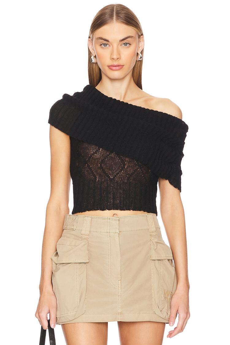 A semi-sheer black knit cropped sweater top crafted from polyester offers a fitted silhouette with a chic off-shoulder foldover neckline and regular half sleeves. Its ribbed texture adds subtle dimension, making it a versatile choice for casual outings, brunch dates, or night outs during autumn and winter. The pull-on design ensures easy wearability while maintaining a modern, elegant vibe.
