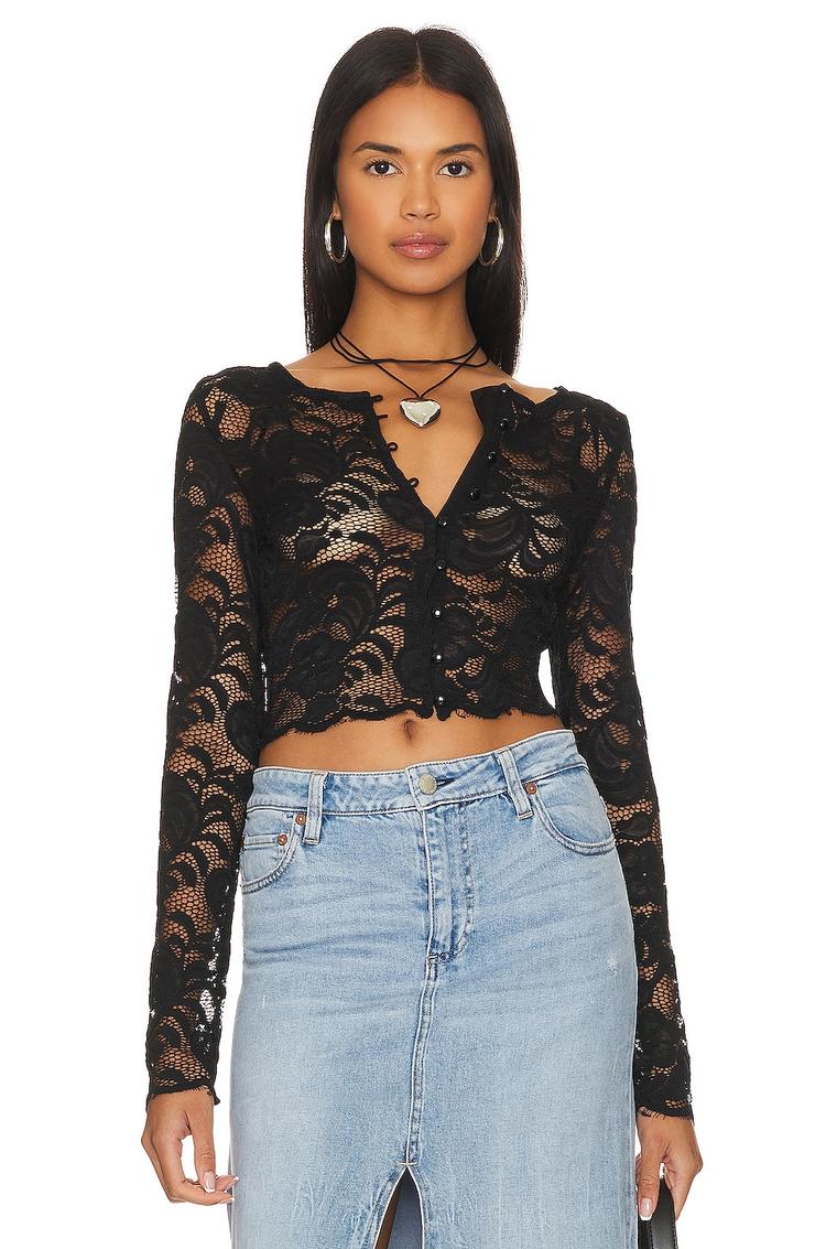 Delicate black lace with a semi-sheer finish defines this cropped top, featuring a slim fit and long sleeves that enhance its modern, chic appeal. The front button closure and V-neckline add subtle sophistication while the all-over lace trim delivers a sexy, elegant texture. Perfect for spring through autumn, this lightweight piece suits casual outings, date nights, and stylish brunches with its versatile, flattering silhouette.