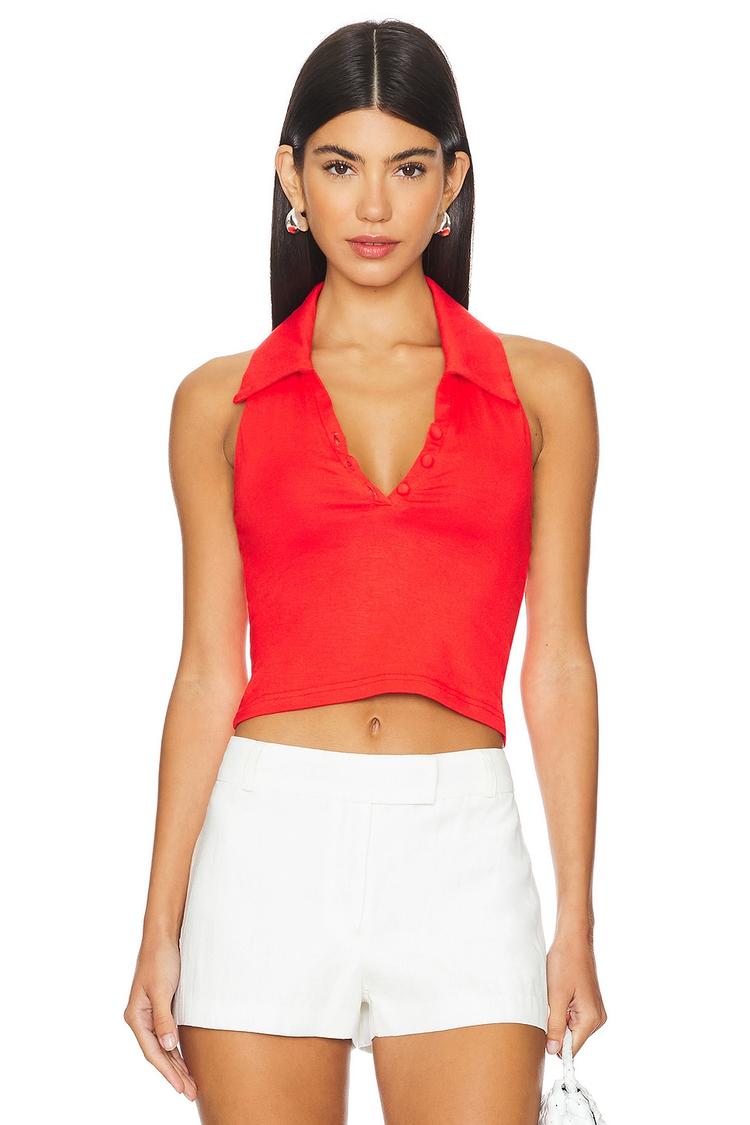 Bold and vibrant, this cropped Iliana Top features a fitted silhouette crafted from soft viscose and elastane jersey fabric. Its sleeveless, strapless design with a sharp collar and button detail at the bust creates a modern, sexy look perfect for spring and summer days. The solid red hue adds a striking pop of color, making it ideal for casual outings, brunch dates, or night outs. The covered back and cropped length offer a sleek, trendy finish that pairs effortlessly with high-waisted bottoms for versatile styling options.
