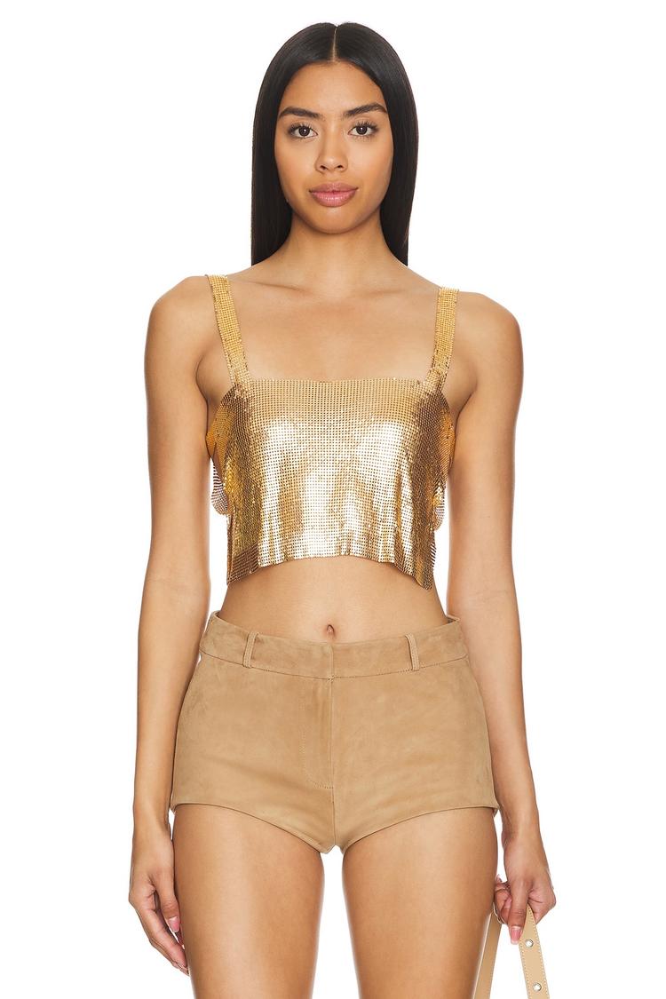 Embrace a moment of glow with this Karla Cut Out Top in dazzling gold lamé. Cropped and ultra-sleek, it features a square neckline and slender spaghetti straps that frame the collarbones, while the open back adds a daring, evening-ready edge. Crafted in a metallic polyester with lustrous Lurex, the top catches light from every angle, creating a party-perfect shimmer. Its boxy, relaxed fit pairs effortlessly with high-waisted shorts or a chic skirt for a night out, festival, or cocktail soirée. Style with minimalist jewelry and strappy heels to let the shine steal the show.