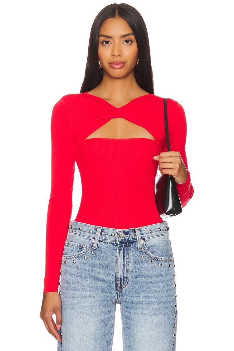 Bold red hues and a sleek silhouette define this fitted shell top, crafted from a soft viscose blend with nylon and elastane for comfortable stretch. The long sleeves and straight neckline frame a chic front cut-out detail, mirrored by a keyhole back with a subtle button closure, adding a modern, sexy edge. This waist-length knit is perfect for casual days, brunches, or night outs, delivering effortless style and versatility. Its minimalist design and vibrant color make it a standout piece for any season.