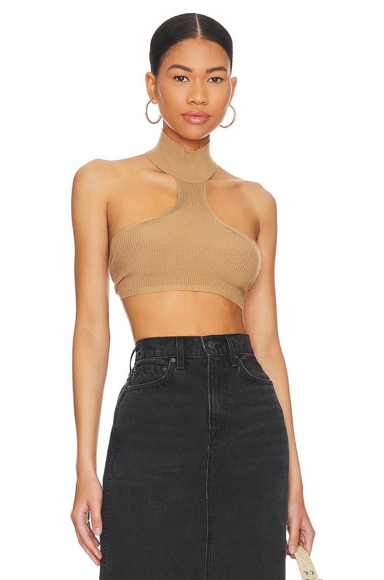 Ribbed knit fabric and a sleek turtleneck neckline define this fitted cropped top in a matte tan hue. Featuring a strapless sleeve styling and a distinctive tie-back closure, it offers a backless silhouette that is both modern and chic. Ideal for spring and summer, this versatile piece transitions effortlessly from casual daywear to stylish brunch or night out occasions. Its flattering cropped length and comfortable stretch blend of viscose, nylon, and elastane make it a standout addition to any trendy wardrobe.