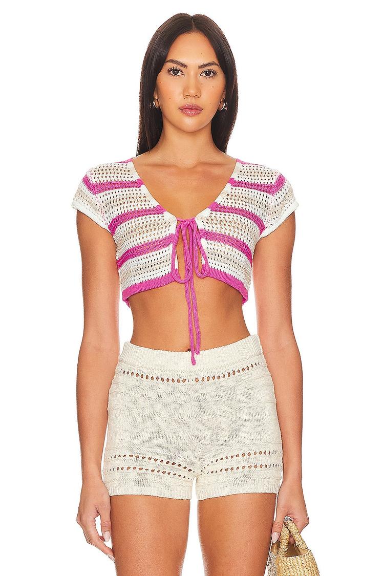 Shimmering with sun-kissed charm, the Laurel Knit Top by Superdown is a cropped, open-crochet knit in white with playful pink stripes. The front drawstring closure and back-tie detail create a flirtatious, adjustable silhouette. Made in acrylic, the sheer knit skims the body with cap sleeves and a classic crew neck for a relaxed vibe. Pair with high-waisted denim or a breezy beach skirt for vacation days, festivals, or garden soirées. Lightweight and versatile, this top invites carefree styling—just remember the sheer nature means undergarments will show through, amplifying its flirty, carefree appeal.