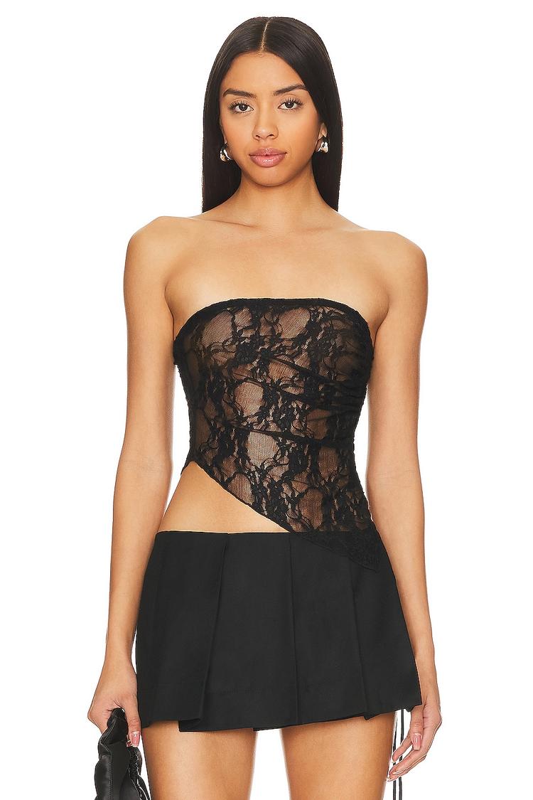 Delicate sheer lace and an asymmetrical hem define this fitted corset top in classic black. The strapless, sleeveless design with a straight neckline crafts an edgy, modern silhouette perfect for summer nights. Lightweight polyester fabric offers a comfortable yet daring look that transitions seamlessly from casual outings to date nights or girls night events. This Lucy Top from superdown embraces a confident, sexy style that makes a striking statement wherever you go.