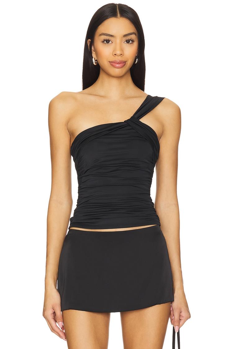Sleek and modern, this fitted cropped top features a striking asymmetric neck and one-shoulder strap that adds a bold twist to your summer wardrobe. Crafted from a midweight slinky polyester-elastane blend, it offers comfortable stretch and a flattering ruched texture all over. The sleeveless design and waist-length cut make it perfect for warm days and nights out alike. Versatile enough for casual outings, date nights, or chic evening events, this minimalist black top brings effortless style and subtle sophistication to your look.