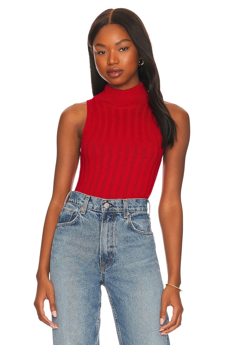 Soft ribbed knit fabric and a fitted silhouette define this sleeveless tank top with a classic turtleneck. Its waist-length cut offers a sleek, minimalist appeal, perfect for layering or wearing solo. The solid red hue adds a vibrant pop to casual, everyday looks, making it an excellent choice for brunch dates, casual outings, or relaxed work environments. Crafted from a comfortable viscose blend, this knit top balances style and ease effortlessly.