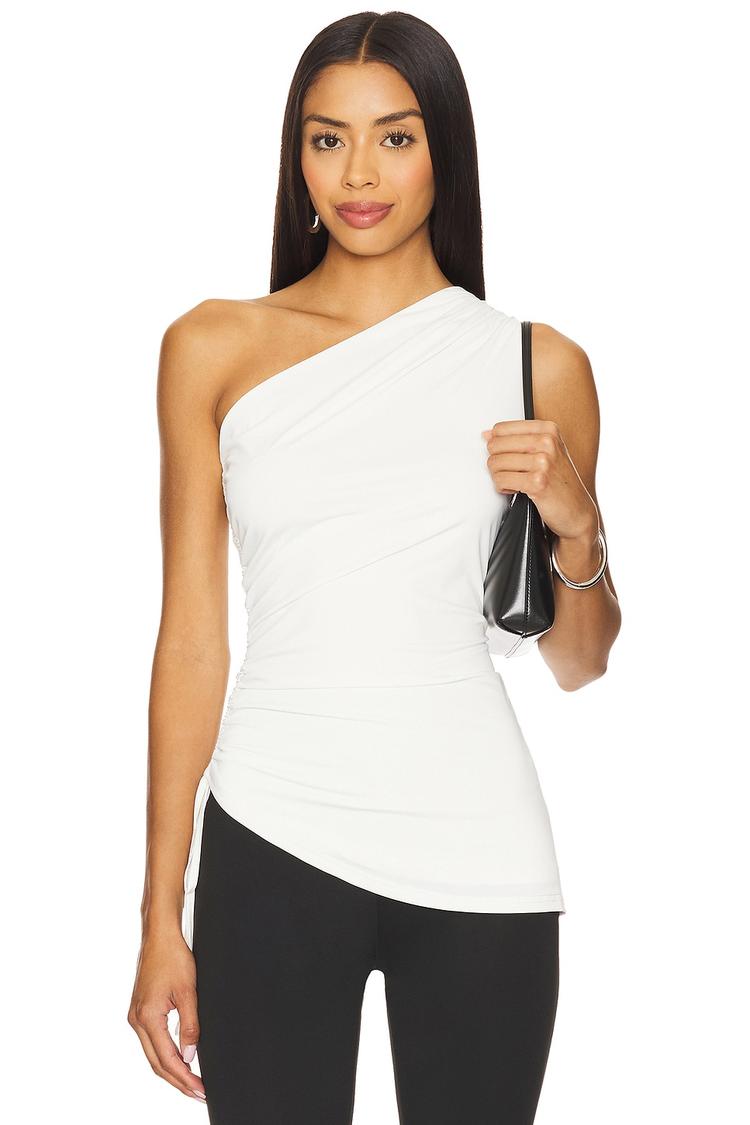 Sleek and modern, this asymmetrical hip-length top features a one-shoulder neckline with strapless styling on the other side, crafted from slinky polyester-elastane jersey fabric. The slim fit silhouette is enhanced by delicate ruching and a side tie-up accent, adding subtle texture and flair. Ideal for spring and summer, this versatile piece transitions effortlessly from casual outings to date nights and night outs, offering a chic and sexy vibe that complements various looks.