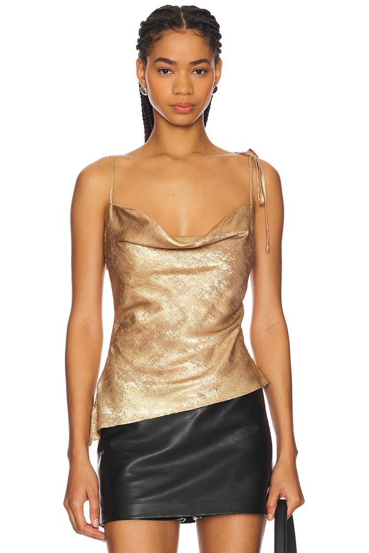 Shimmering gold satin and a fitted silhouette define this chic tank top with adjustable spaghetti straps and a flattering cowl neck. Its hip length and lightweight feel make it an ideal choice for warm spring and summer evenings. Designed with a hidden side zipper for a sleek finish, this top effortlessly transitions from casual daytime outings to stylish date nights and lively nights out. The smooth satin fabric adds a touch of modern elegance, making it a versatile staple in any wardrobe.