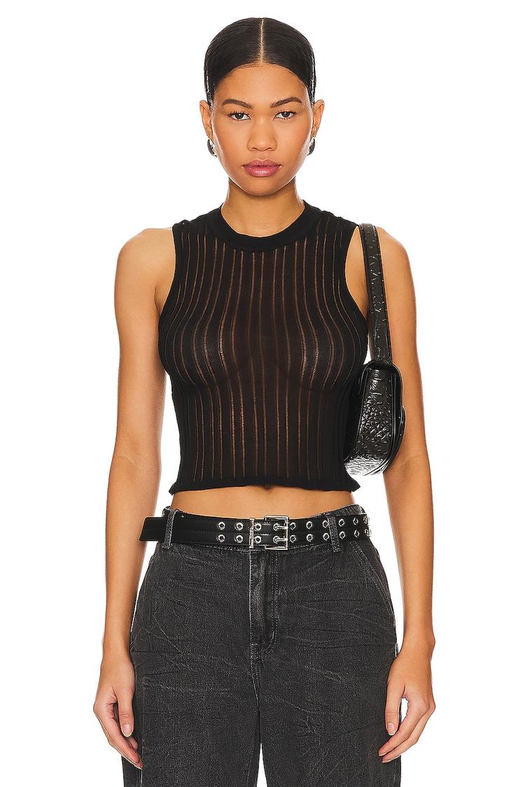 Lightweight viscose knit and a slim fit define this Riley Tank, featuring a classic crew neck and sleeveless wide straps for breathable comfort. Its cropped length with a delicate lettuce hem ruffle adds a subtle feminine touch to the edgy, grunge-inspired silhouette. Perfect for layering or wearing solo, this black tank is ideal for casual days, everyday errands, or relaxed weekend outings, combining casual chic with an effortless cool vibe.