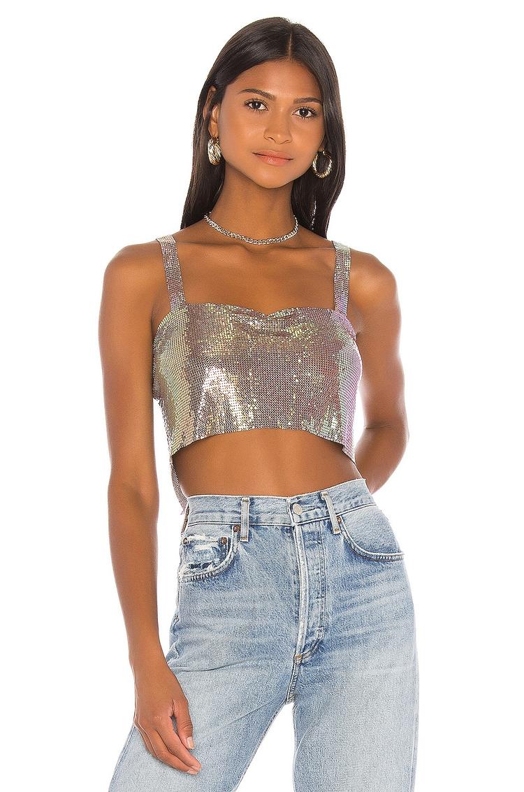 Shimmering with an iridescent metallic finish, this cropped top features a sleek square neckline and delicate spaghetti straps that highlight a slim, sexy fit. The standout open back is adorned with a silver chain detail and secured by a lobster clasp hook closure, adding edgy sophistication. Crafted from polyester with a smooth texture, this versatile piece is perfect for night outs, girls nights, or cocktail events, combining bold style and comfort for a confident, trend-forward look.
