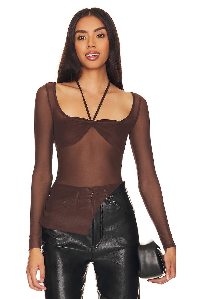 Delicate sheer mesh fabric and a halter neck tie closure define this modern cropped top, featuring long regular sleeves and a raw-cut asymmetric hem that adds an edgy finish. The slim fit and bust lining enhance its silhouette, making it a striking choice for night outs, date nights, or girls' night gatherings. Crafted from a polyester-spandex blend, this matte dark brown piece offers both comfort and style for all-weather wear.
