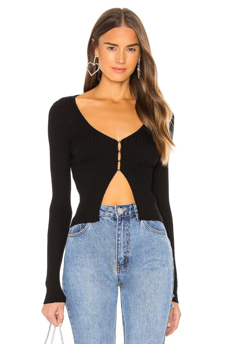 Sleek rib knit texture and a fitted silhouette define this cropped top, featuring a chic V-neck and long regular sleeves. The partial front hook-and-eye closure adds subtle detailing, enhancing its minimalist modern appeal. Crafted from a comfortable blend of viscose, nylon, and elastane, this versatile piece works effortlessly for casual outings, brunch dates, or night out events. Its matte black hue makes it a timeless staple that pairs well with high-waisted denim or skirts, perfect for all seasons and easy to style for multiple occasions.