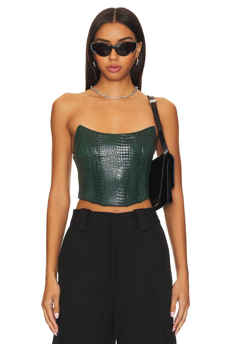 Snake-embossed texture and a boned bodice define this fitted cropped corset top in a matte dark green hue. The strapless, sleeveless design with a straight neckline creates a sleek silhouette ideal for spring and summer nights. Featuring a back zipper closure, this edgy and trendy piece pairs perfectly with high-waisted bottoms for night outs, date nights, or girls' gatherings. Crafted from a polyester-spandex blend, it offers both style and stretch, making it a standout choice for chic, fashion-forward occasions.