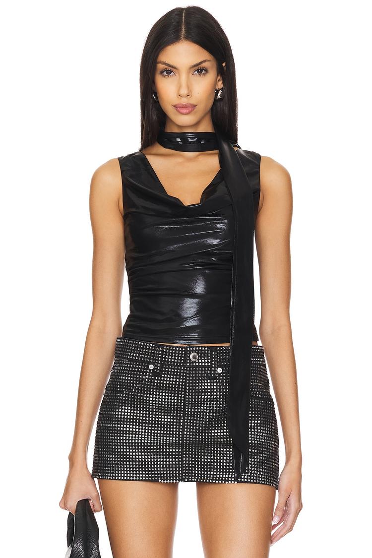 A sleek black tank top crafted from a shiny polyester-elastane blend offers a fitted silhouette that hugs the waist length hem. Featuring a cowl neckline and wide straps, this sleeveless design embodies edgy and trendy style perfect for spring and summer. Its versatile look suits casual outings, night outs, and date nights effortlessly, making it a staple for chic wardrobes.