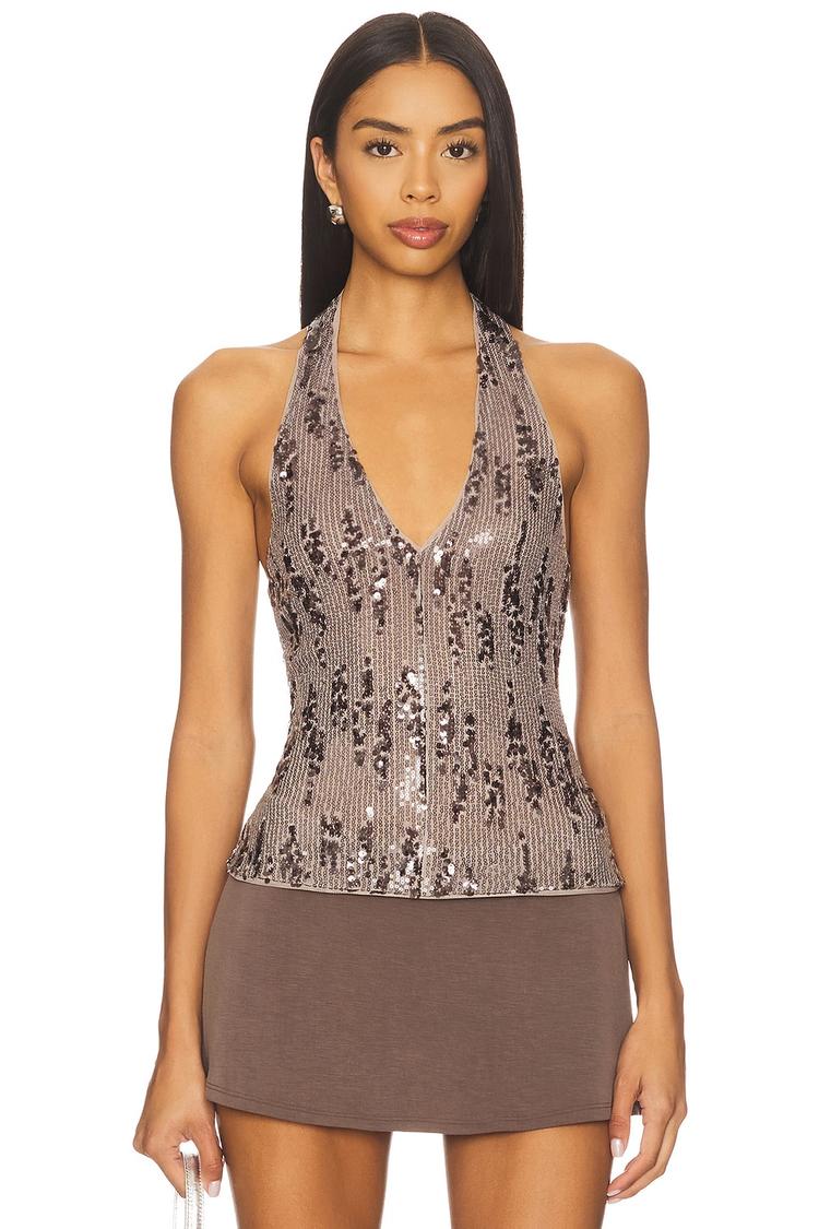 Dazzle the night away in this fitted taupe camisole featuring a plunging V-neckline and shimmering black sequin embellishments all over. Crafted from a comfortable polyester-elastane blend, it hugs the body with a sleek silhouette and strapless styling perfect for summer evenings. The strappy back adds a trendy touch, making it ideal for girls' nights, parties, or night outs. This hip-length top pairs effortlessly with skirts or tailored pants, balancing sexy and chic for versatile evening wear.