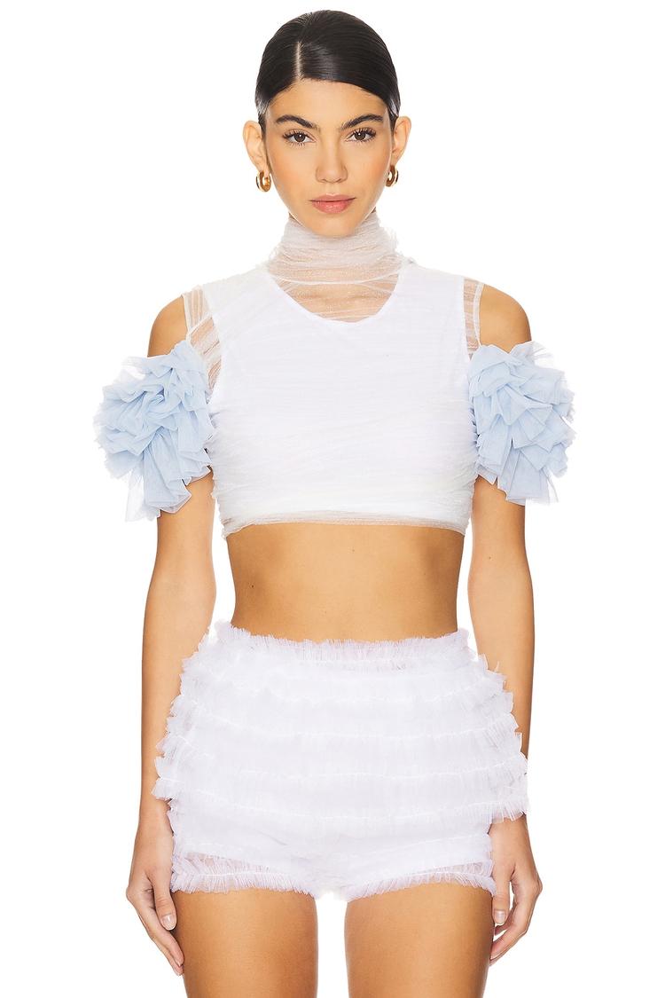 Delicate chiffon fabric and a fitted wrap silhouette define this cropped top, featuring romantic puffed half sleeves adorned with light blue ruffles. The round neckline and back keyhole button closure add subtle charm, while the pull-on styling ensures easy wear. Perfect for spring and summer days, this lightweight, sheer panelled top blends elegance with a cute, chic vibe. Ideal for casual outings, brunch dates, or romantic evenings, it brings a refreshing pop of soft color and texture to your wardrobe.