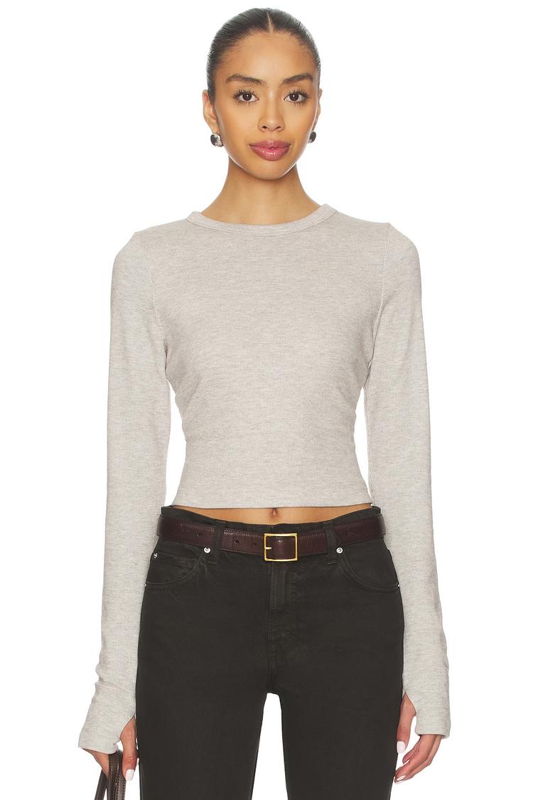 Soft knit fabric in a matte beige hue defines this fitted crew neck top, delivering timeless minimalist appeal. Its long sleeves and waist-length hem provide a comfortable, flattering silhouette perfect for layering or wearing alone. Crafted from a polyester-viscose-spandex blend, this pullover offers gentle stretch and easy care, making it an ideal choice for casual outings, everyday wear, and relaxed loungewear moments. The covered back and simple styling allow versatile pairing with jeans or trousers for a chic, understated look.