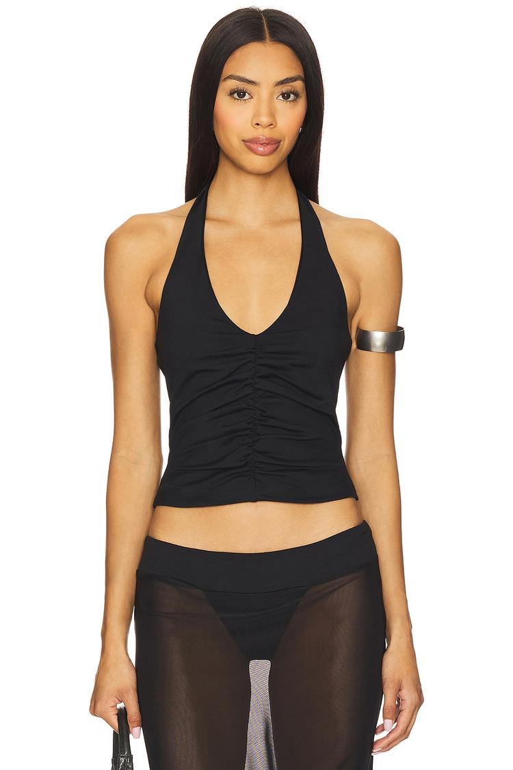 Ruched detailing at the front adds texture to this fitted black halter tank top crafted from midweight nylon and spandex jersey. Featuring a self-tie closure at the back, the sleeveless silhouette with a halter neck and strapless styling offers a sleek, minimalist look perfect for warm weather. Its waist-length cut enhances versatility, making it ideal for casual outings, brunch dates, or night events where a subtle sexy vibe is desired.