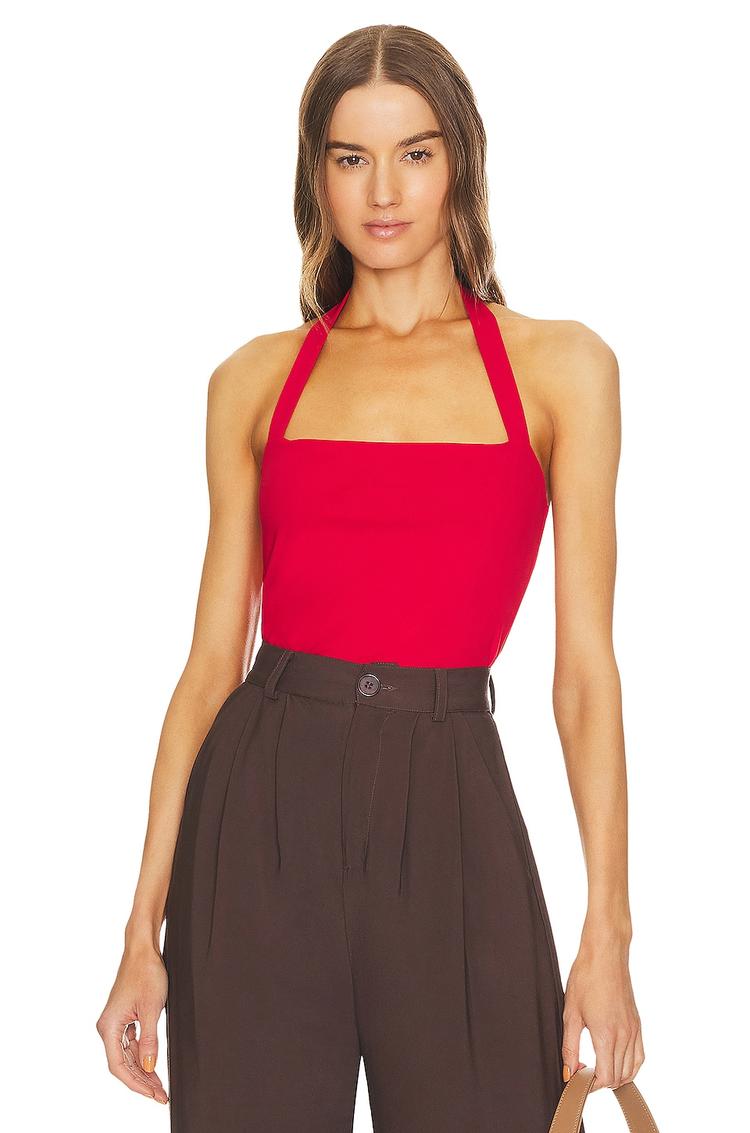 Bright red halterneck tank top crafted from a midweight nylon-elastane jersey blend offers a sleek, fitted silhouette that ends at the waist. The sleeveless design with strapless styling and covered back creates a minimalist yet chic look ideal for warm spring and summer days. This versatile top is perfect for casual outings, brunch dates, or vibrant night outs, pairing effortlessly with tailored trousers or skirts for a polished appearance.