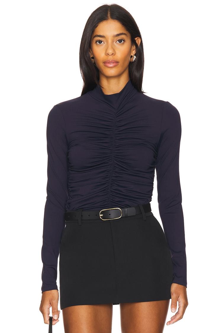 A sleek mock neck and gathered front define this fitted top crafted from a midweight, stretchy nylon-spandex jersey. The long sleeves and concealed back zip closure enhance its sophisticated silhouette, while the ruched detailing down the front adds a touch of modern texture. Perfectly tailored to hip length, this dark navy top pairs effortlessly with skirts or trousers, making it ideal for casual days, business casual settings, or date nights. Its versatile design and chic finish ensure a polished look across multiple seasons.