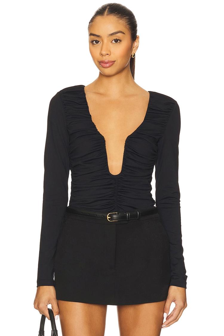 Sleek and modern, this black gathered shell top features a distinctive square neckline with a plunging wire detail that adds edge to its slim silhouette. Crafted from stretch nylon and elastane jersey, it promises a flattering fit with long sleeves and subtle ruching along the front. The waist-length hem balances the daring neckline, making it suitable for casual outings, business casual settings, or a night out. Its minimalist design and sophisticated vibe elevate everyday style with effortless comfort and a chic finish.