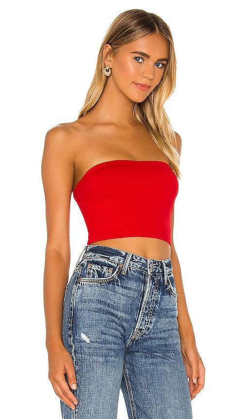 SUSANA MONACO STRAPLESS CROP TOP IN RED.