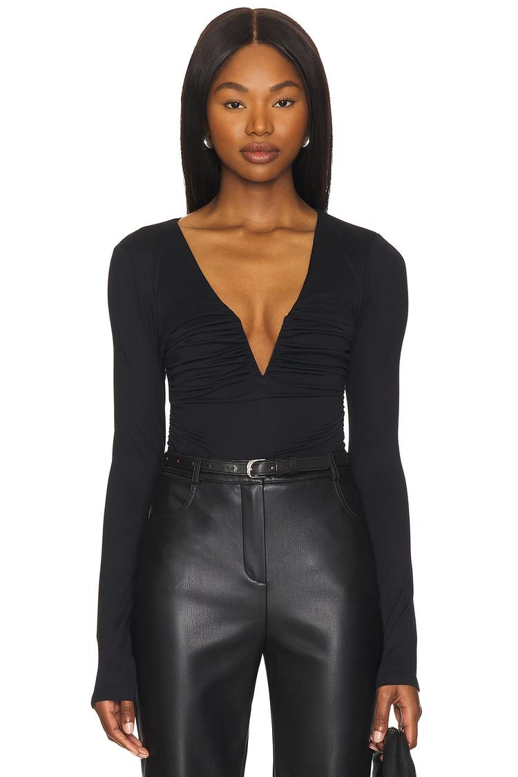 Deep necklines and elegant ruching bring a sophisticated edge to this fitted long sleeve top crafted from soft nylon-elastane jersey knit. The hip-length silhouette and pullover design make it a versatile choice for autumn and winter, perfect for date nights, casual outings, or business casual settings. Its sleek black hue enhances its chic appeal, while the covered back and regular sleeves provide a classic touch. This top balances comfort and style effortlessly for a confident, refined look.