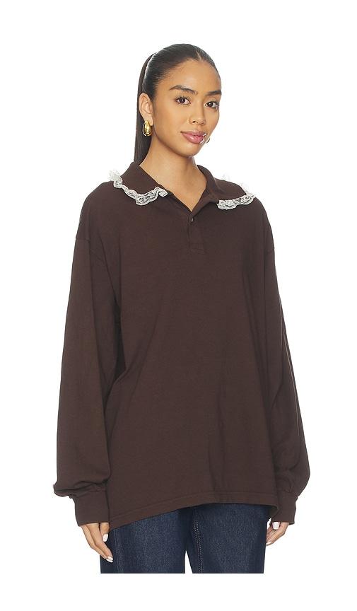 TANNER FLETCHER CLETUS LACE TRIM POLO TOP IN BROWN.