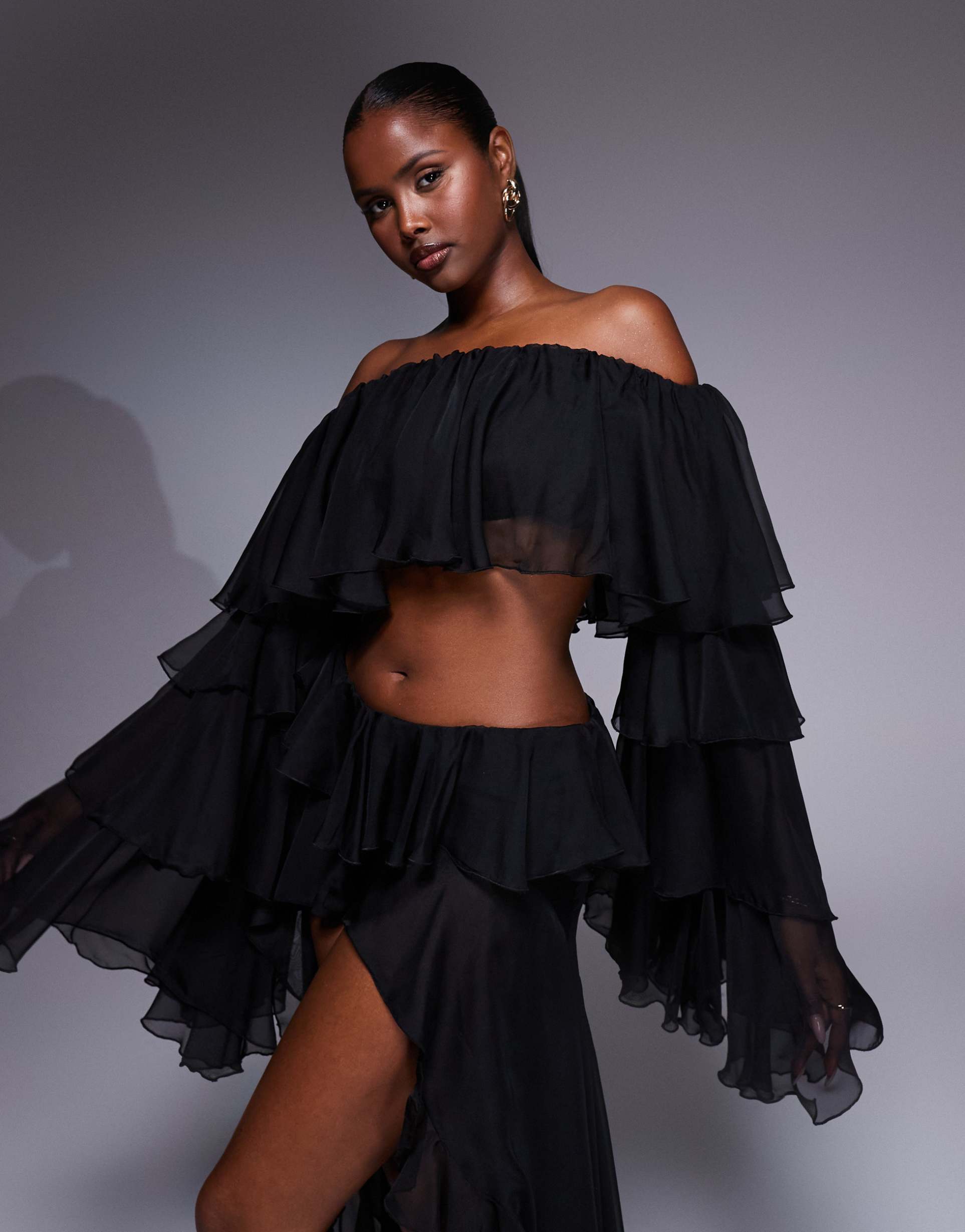 Flowing ruffles and a dramatic off-shoulder neckline define this black cropped top crafted from sheer polyester fabric. The romantic, regular fit silhouette features long, tiered sleeves and a bardot style that beautifully highlights the shoulders. Ideal for spring and summer occasions, it pairs perfectly for casual outings, night outs, or date nights. The all-over ruffle design adds a chic and sexy flair, making it a standout piece for versatile styling.