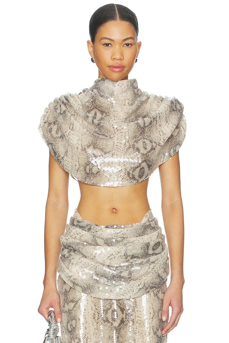 Lightweight sequin fabric and a high neck define this cropped top with a fitted silhouette and dramatic cape-style sleeves. The all-over beige and brown animal print adds a chic, trendy vibe, while the keyhole back with button closure offers a subtle touch of allure. Perfect for spring and summer nights, this sexy piece transitions effortlessly from cocktail parties to night outs, making it a must-have for those looking to make a statement with shimmer and texture.