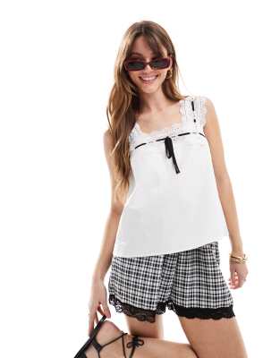 Delicate eyelet lace trim and a contrast black bow accentuate the front of this white smock top, featuring a flattering square neck and fixed wide straps. Crafted from soft, lightweight cotton, it offers a regular fit and a comfortable hip-length silhouette. Ideal for casual days, loungewear, or sleepwear, this top blends charming details with everyday ease, perfect for spring and summer wear. Its versatile design suits a range of occasions from relaxed home days to casual outings.