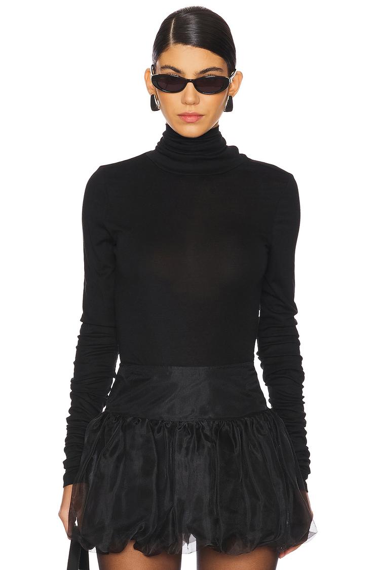 Embrace sleek minimalism with this Bree Long Top, a black knit that floats between everyday ease and quiet elegance. Crafted in a breathable Lyocell-wool blend with a touch of elastane, it drapes to a slim, longline silhouette. The turtleneck anchors the look while the sleeves are thoughtfully bunched for subtle texture. A layered, lace-trim hem adds flirtatious movement to an otherwise clean, pull-on design. Perfect for city days or layered evenings, it pairs flawlessly with denim or a midi skirt, offering chic versatility from desk to dinner.