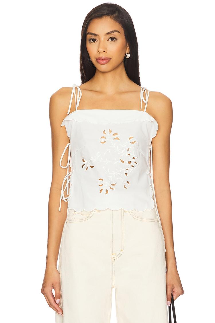 Lightweight voile fabric and delicate embroidery define this white camisole with a straight neckline and adjustable spaghetti straps tied at shoulders and sides. The regular fit and waist length silhouette make it an airy, comfortable choice for warm spring and summer days. Perfect for casual outings, brunch dates, or a relaxed vacation vibe, this top blends bohemian charm with casual chic style. The subtle cut-out accents add a romantic, handcrafted feel to elevate everyday looks effortlessly.