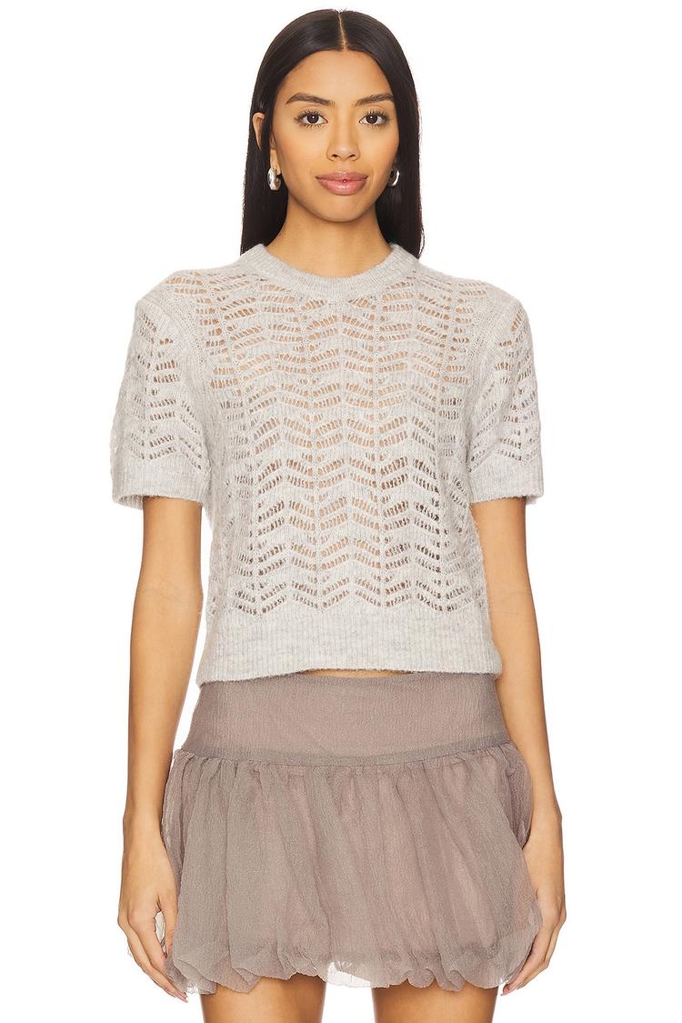 Delicately crafted in a midweight knit, this shell top features an all-over eyelet embroidery pattern that adds subtle texture and a sheer effect. The classic crew neck and half sleeves offer a regular fit ideal for layering or standalone wear. Its pullover design and ribbed trim ensure comfort and ease, making it perfect for casual outings, everyday wear, and business casual settings during cooler seasons. The light gray hue brings a minimalist, chic vibe that pairs effortlessly with skirts or trousers for a refined look.