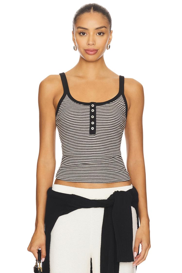 Softly knitted with a cotton-polyester blend, this slim tank features a classic black and white striped pattern all over. Designed with wide straps and a scoop neck, it offers a flattering silhouette with a hip-length cut. The partial front button closure adds subtle detail to its minimalist style. Ideal for spring and summer, this versatile tank pairs effortlessly for casual outings, everyday wear, or vacation looks, combining comfort with understated chic.