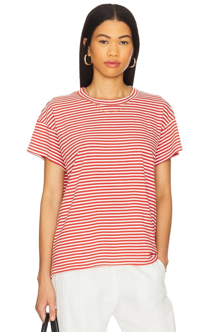 Soft, midweight cotton knit fabric combines with a relaxed boxy fit and classic crew neckline to create this striped t-shirt. Featuring regular half sleeves and a ribbed collar, its hip-length silhouette offers casual comfort and effortless style. The all-over red and white stripes add a timeless pattern ideal for casual, everyday wear, travel, or brunch outings. This versatile piece balances simplicity and chic minimalism, making it an easy staple for spring through autumn wardrobes.