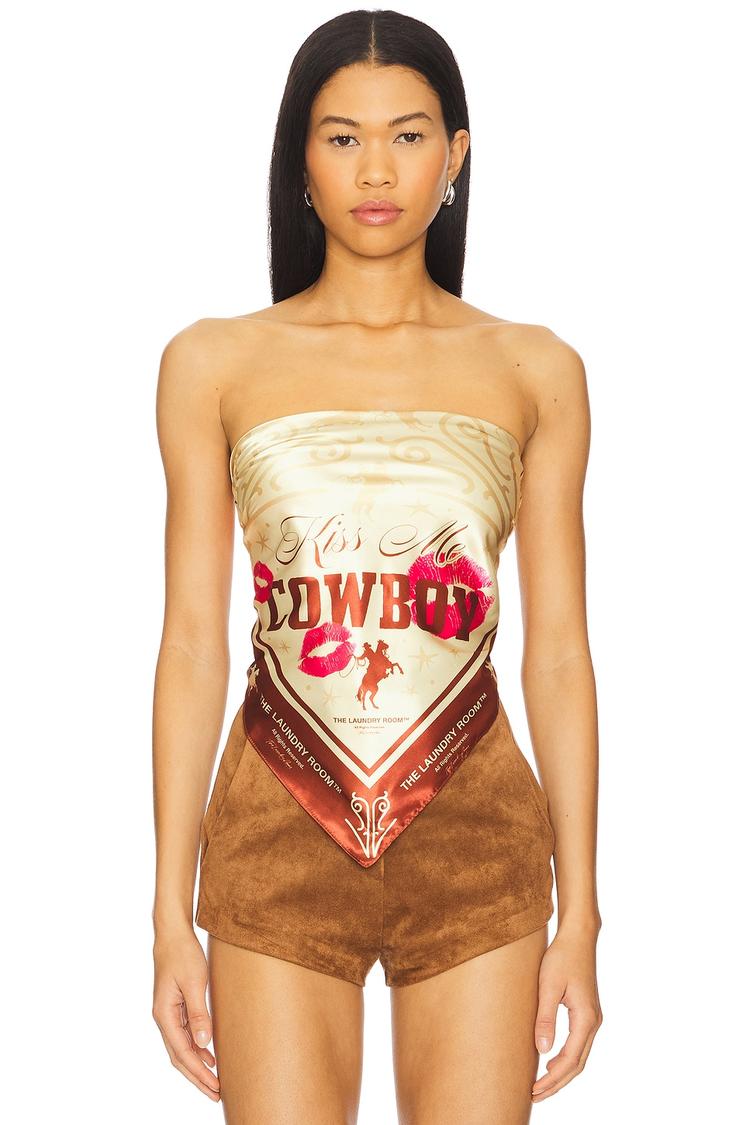 Feel the sun-soaked breeze in this The Laundry Room x Revolve Kiss Me Cowboy Bandana top. A strapless, cropped tube silhouette in satin-feel 100% polyester, it flaunts a cream base replete with bold red and brown bandana print. The pullover, sleeveless design hugs the body with a sleek, fitted shape, perfect for warm-weather days. Team it with high-rise denim, a flowing skirt, or pair with the matching bandana scarf for a coordinated Western-chic look. Lightweight, easy to wear, and endlessly versatile for festivals, beach days, or casual city strolls. Effortless styling, unforgettable attitude.