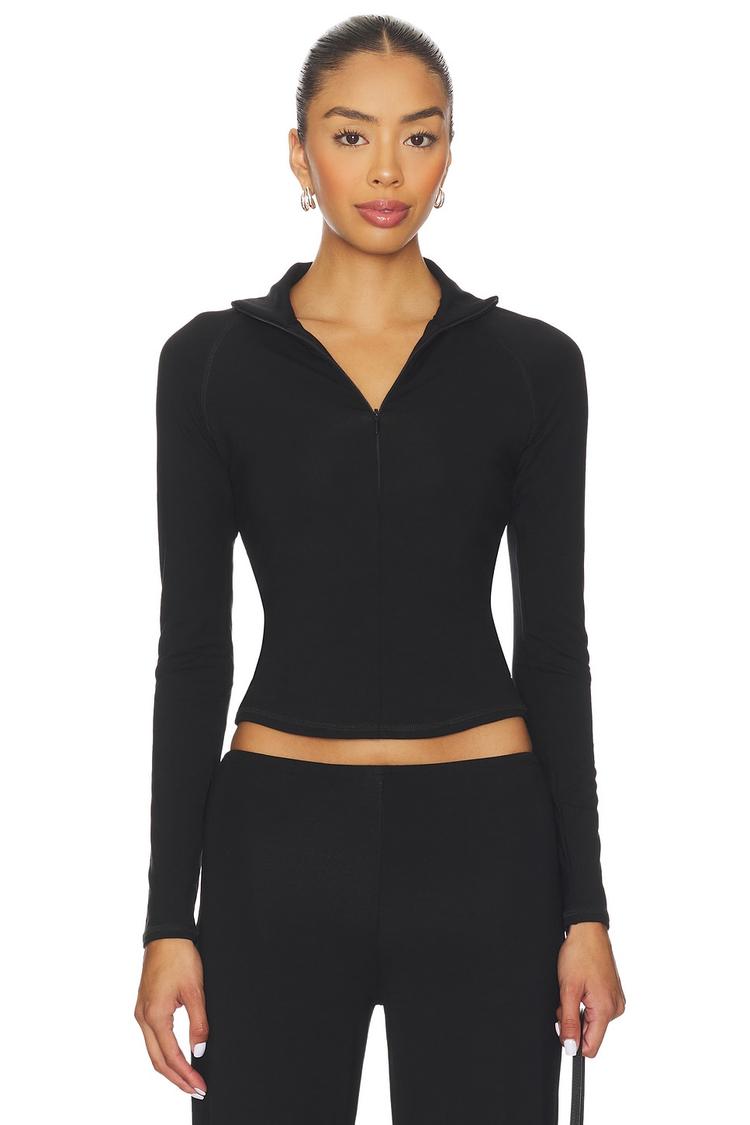 A sleek matte black longline top crafted from a soft blend of tencel and elastane offers a fitted silhouette that contours the body. Featuring a classic collar and a practical half zipper closure at the front, it combines minimalist style with modern functionality. The long sleeves and waist-length hem make it perfect for layering or standalone wear. Ideal for casual outings, workwear, or business casual settings, this versatile piece ensures comfort and style across all seasons.