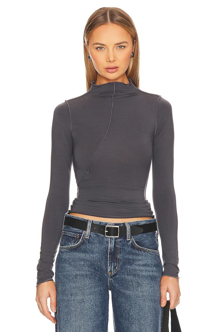 Soft jersey fabric and a sleek mock neck create a refined silhouette with this fitted top. The long sleeves and waist-length hem provide cozy coverage, while inverted seams add subtle detailing for a modern edge. Perfectly suited for casual days, workwear, or travel, it transitions effortlessly across seasons from spring to winter. Its minimalist style pairs well with jeans or tailored trousers, making it a versatile staple for everyday and business casual wardrobes.