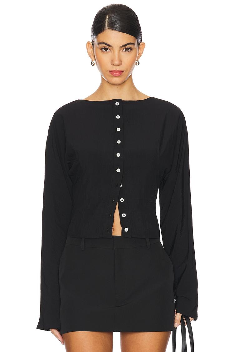 Fitted to perfection with a sleek round neck and long regular sleeves, this matte black shell top features a unique dual front and back button closure that adds a contemporary twist. Crafted from a lightweight rayon-nylon jersey fabric, it offers breathable comfort and a sophisticated silhouette at waist length. Designed for versatility, it suits casual days, workwear, and business casual settings alike, making it a chic essential for all seasons.
