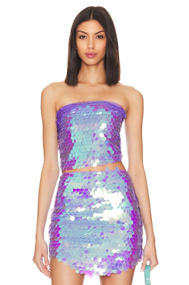 Shimmering with oversized sequins in light purple and blue hues, this fitted bandeau top features a strapless neckline and sleeveless styling that perfectly embraces summer nights. Crafted from lightweight polyester fabric, its cropped length and pullover design make it an easy yet striking choice for night outs, cocktail events, or parties. The all-over sequin embellishment adds a glamorous touch, making it a standout piece for bold, trendy, and chic looks.