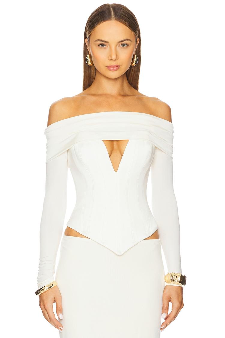 Off-shoulder allure meets structured elegance in this fitted corset top crafted from smooth crepe polyester. Featuring a plunging neckline and long sleeves, this waist-length piece is tailored with boning for a flattering silhouette and secured with a back zipper closure. Its solid white hue lends a sophisticated, chic vibe perfect for date nights, cocktail parties, or stylish night outs. The refined design and versatile fabric make it a standout choice for those seeking a polished yet striking topwear option.