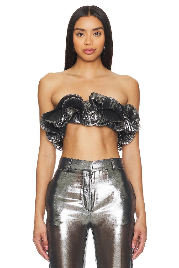 Shiny metallic polyester brings a bold edge to this bandeau top, featuring dramatic all-over ruffles that create a standout silhouette. The strapless neckline and sleeveless design emphasize a fitted, cropped shape that’s perfect for warm-weather nights. A hidden side zipper ensures a sleek finish while the dark metallic finish adds a futuristic, chic vibe. This Lilou Top pairs effortlessly with high-waisted trousers or skirts, making it ideal for cocktail events, night outs, or stylish parties where you want to make a confident statement.