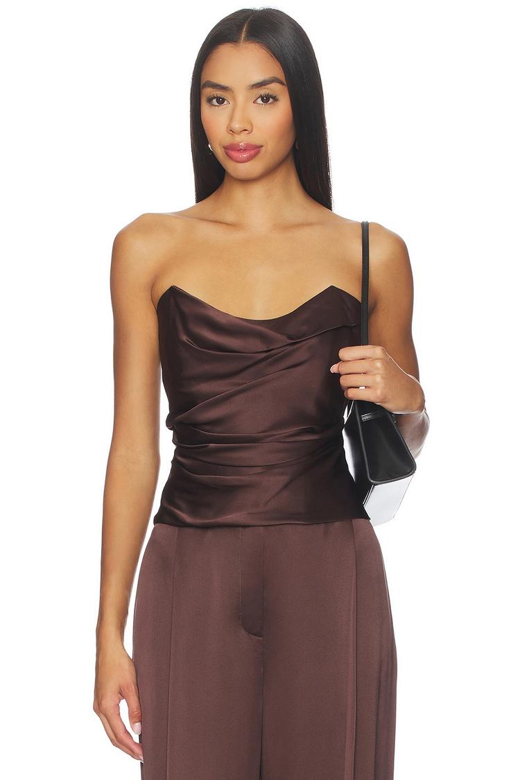 A luxurious cowl neck bustier crafted in midweight matte dark brown silk satin, featuring a fitted silhouette with structured boning for an elegant shape. The strapless design and side zipper closure enhance its sleek finish, making it perfect for cocktail parties, night outs, and date nights. This waist-length corset blends sophisticated style with chic simplicity, ideal for those seeking a refined yet striking look that shines across seasons and occasions.