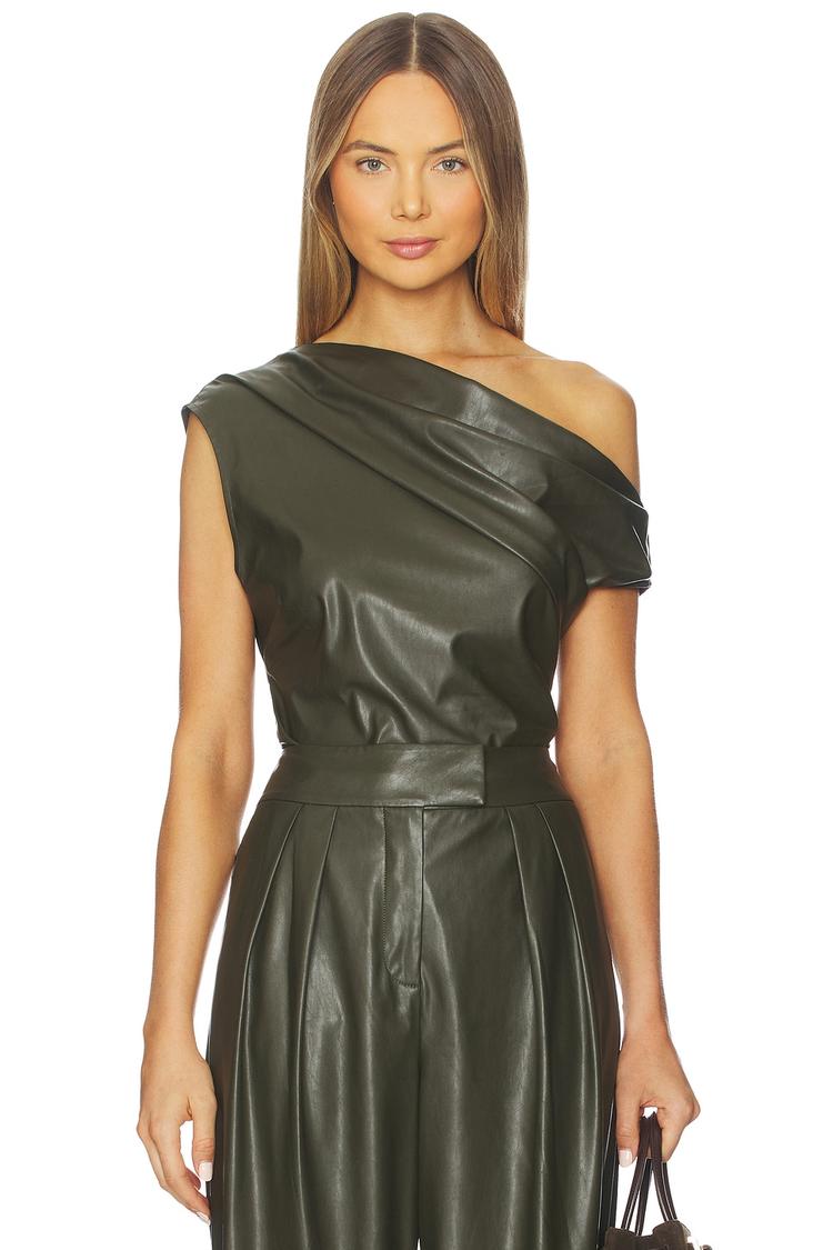 Sleek matte dark green faux leather defines this fitted wrap top with an elegant off-shoulder neckline and wide strap sleeve styling. Featuring subtle ruching detail on the front and a hidden side zipper closure, this waist-length top blends sophistication with modern edge. Ideal for casual days, workwear settings, or night out occasions, it offers versatile chic appeal across seasons. Crafted from a polyester-polyurethane blend, it provides a structured yet comfortable silhouette that elevates any ensemble.