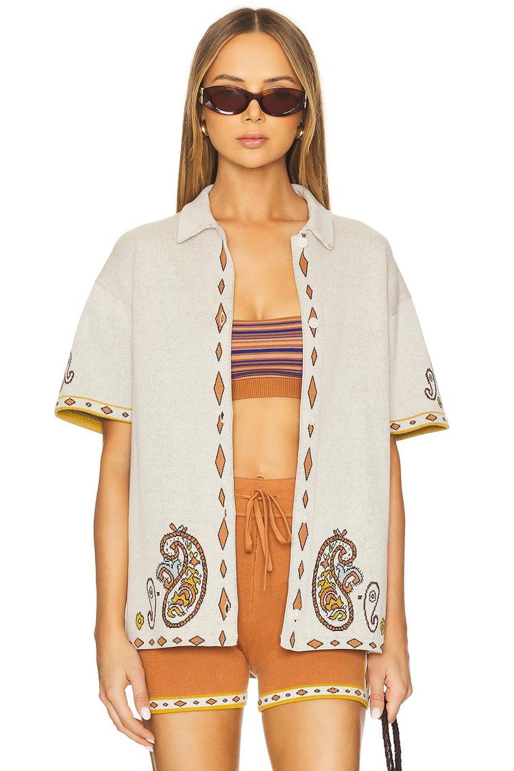 Soft organic cotton and linen blend forms this relaxed hip-length shacket featuring half sleeves and a classic polo collar. The off-white base is beautifully enhanced with geometric and paisley patterns in brown and yellow hues along the front, hem, and sleeve borders, adding a distinct bohemian charm. With front button closure and a midweight knit fabric, this versatile piece is ideal for casual outings, brunch dates, or vacation wear, blending comfort with an easygoing, stylish vibe.