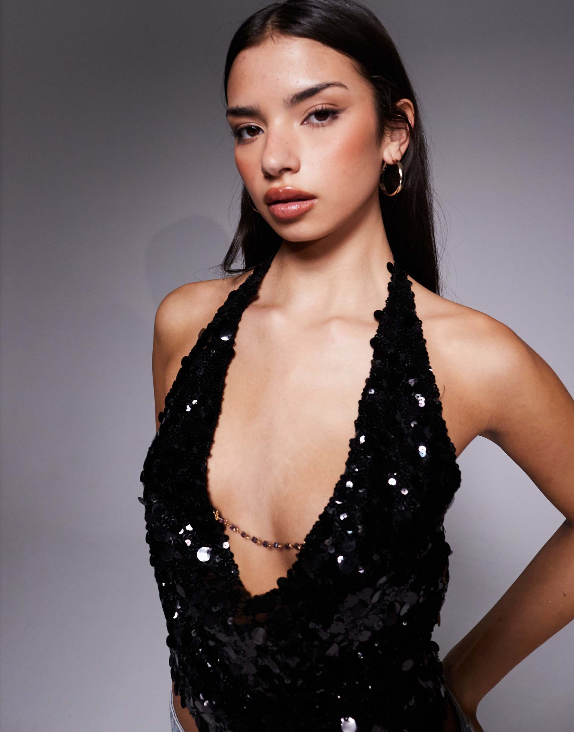 TIGER MIST ZANA HALTERNECK DISC SEQUIN CHAIN COWL DETAIL TIE BACK TOP IN BLACK