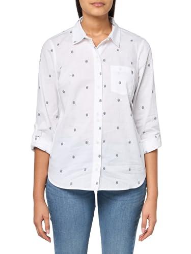 Effortless, timeless styling meets casual polish in this Tommy Hilfiger white cotton shirt. Crafted from breathable cotton, it features a classic collared neckline, a front button placket, and a chest pocket for laid-back utility. A subtle navy logo print glints across the white surface, giving the piece signature branding without overpowering the clean silhouette. Sleeves are long but shown rolled to three-quarter length with a practical roll-tab, enhancing versatility. The hip-length hem makes it easy to tuck or wear loose with jeans, trousers, or a skirt—perfect for work, weekends, or layering under a blazer for a polished look.